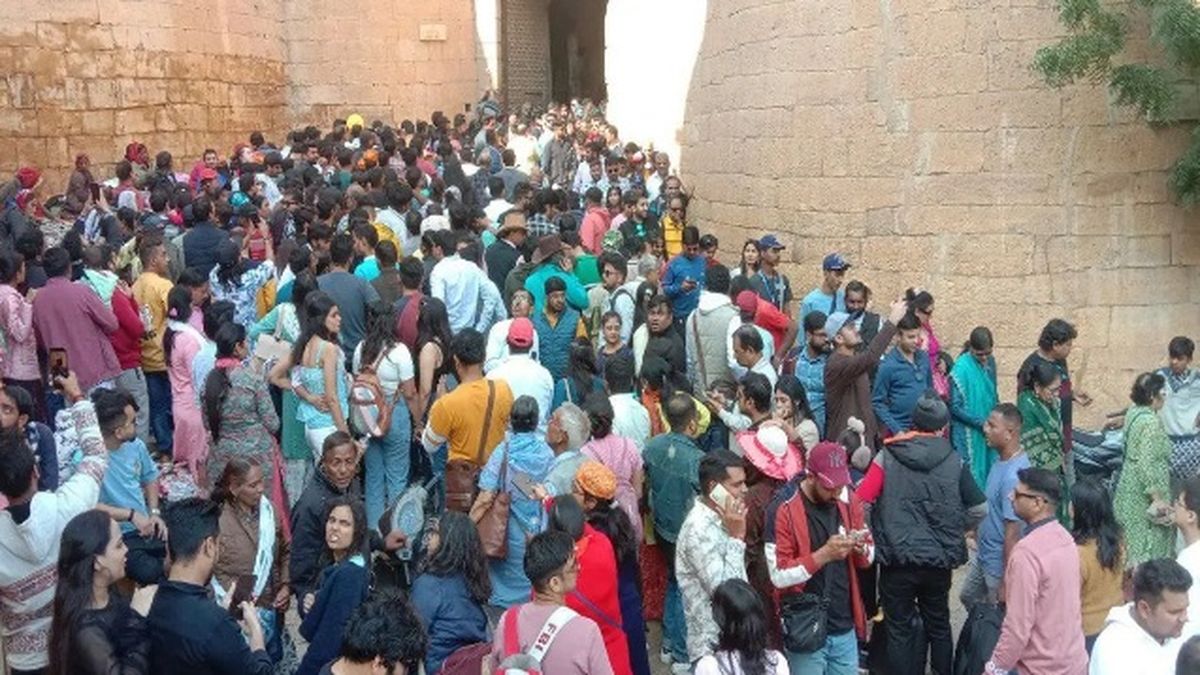 सूरज प्रोल से बाहर निकलते व यहां से दुर्ग के भीतर जाने के लिए सैलानियों के बीच हो रही मशक्कत, गणेश प्रोल की गोलाईदार घाटी में फंसे दुपहिया वाहन और भीड़ में बेहाल बुजुर्ग, घाटियों को चढऩे के बाद हवा प्रोल में भी आवाजाही के लिए मशक्कत…। यह नजारा इन दिनों जैसलमेर के ऐतिहासिक सोनार किले में सुबह देखने को मिल रहा है। शहर के ऐतिहासिक सोनार दुर्ग में दीपावली के बाद से हजारों पर्यटकों का जमावड़ा देखने को मिल रहा है। दुर्ग की घाटियों में सर्पिलाकार रास्तों पर भीड़ इतनी अधिक है कि पांव रखने तक की जगह नहीं मिल पा रही। सुबह-सुबह दुर्ग की ओर बढ़ते गुजराती, देशी और विदेशी सैलानियों के समूह संकरी राहों पर ठिठक जाते हैं। चार प्रोलों से होकर गुजरने वाला यह एकमात्र रास्ता हजारों लोगों के चढऩे-उतरने के लिए अपर्याप्त साबित हो रहा है। स्थानीय निवासियों और दुर्गवासियों के साथ-साथ पर्यटकों को भी आने-जाने में गंभीर कठिनाई का सामना करना पड़ रहा है।