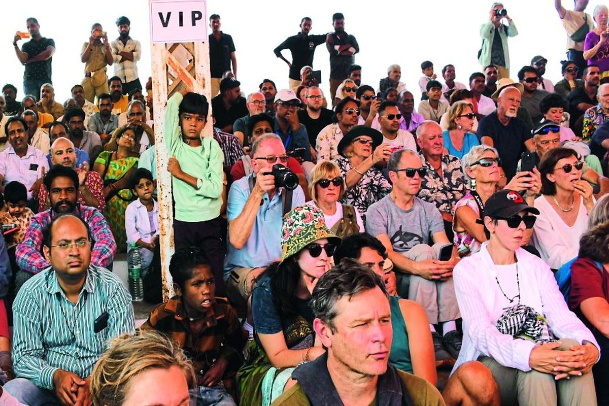 पुष्कर मेला मैदान में सोमवार को प्रतियोगिताएं देखते विदेशी सैलानी।