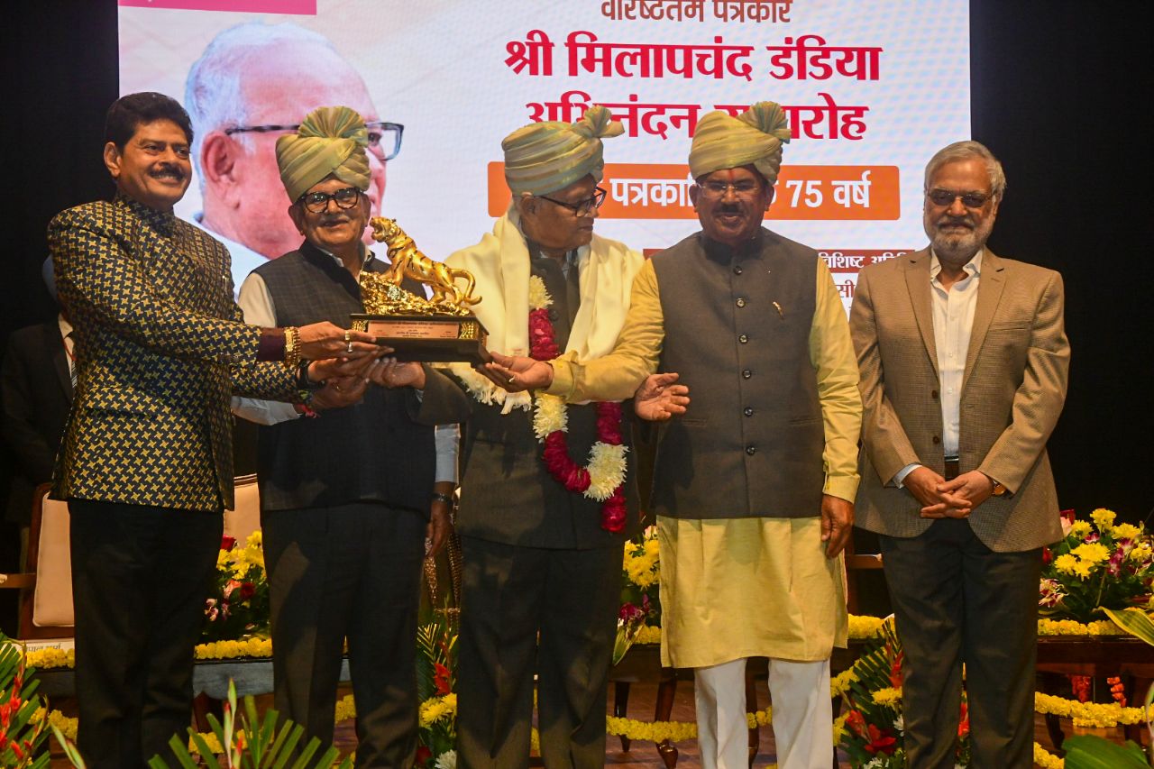 वरिष्ठ पत्रकार मिलापचंद डांडिया का सम्मान करते सिविल लाइन जयपुर के विधायक गोपाल शर्मा, पंजाब का राज्यपाल गुलाबचंद कटारिया, विधानसभा अध्यक्ष वासुदेव देवनानी, और पूर्व विधानसभा अध्यक्ष सीपी जोशी। फोटो अनुग्रह सोलोमन।