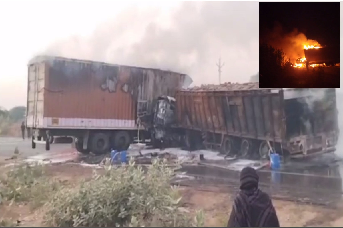 Nagaur Accident: नागौर-बीकानेर राष्ट्रीय राजमार्ग 58 पर बाराणी गांव के पास मंगलवार सुबह करीब छह बजे एक कंटेनर व ट्रेलर की बीच भीषण भिड़ंत हो गई। हादसे के बाद दोनों वाहनों में आग लग गई।