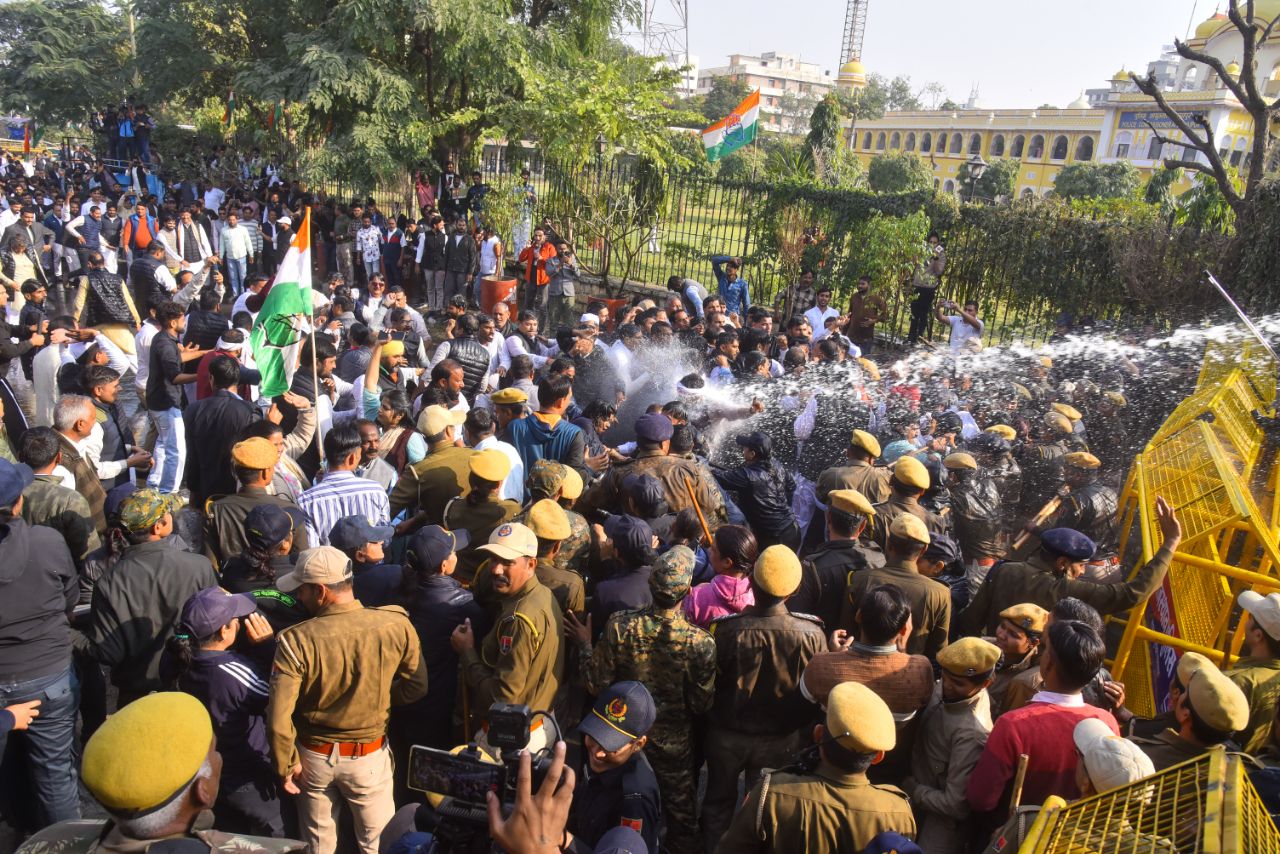 राजभवन को कूच करने पर पुलिस में किया वाटर कैनन का उपयोग। फोटो अनुग्रह सोलोमन।