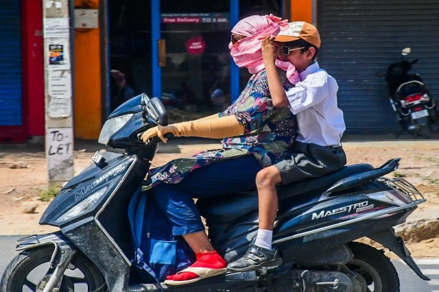 गर्मी में स्कूल से घर लौटते समय टोपी लगा कर जाता बच्चा। फोटो अनुग्रह सोलोमन।
