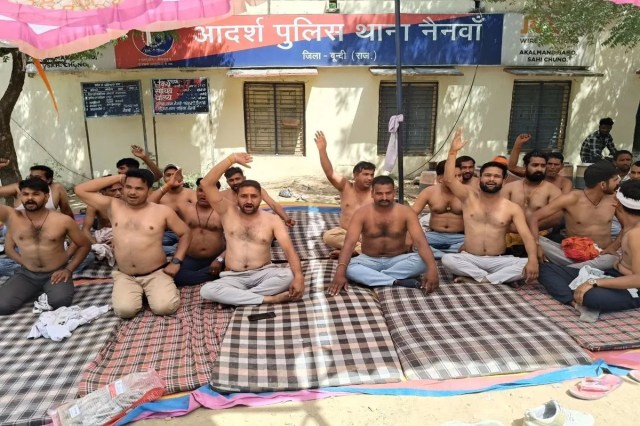 नैनवां. गो तस्करी के मुख्य आरोपियों को गिरफ्तार करने की मांग को लेकर विहिप व बजरंगदल कार्यकर्ताओं का मंगलवार को थाने के बाहर दूसरे दिन अर्द्धनग्न होकर धरना दिया। आरोपियों को गिरफ्तार करने और प्रकरण में लापरवाही बरतने वाले पुलिस कर्मियों को हटाने की मांग को लेकर दो दिन से कार्यकर्ताओं का आंदोलन जारी है। सोमवार को थाने पर प्रदर्शन के बाद थाने के बाहर अनिश्चितकालीन धरने पर बैठे हुए। कार्यकर्ता रातभर धरने पर बैठे रहे। खाना भी धरना स्थल पर ही खाया। मंगलवार सुबह भी खाना धरना स्थल पर ही खाया। अर्द्धनग्न होकर धरने पर बैठे रहे।